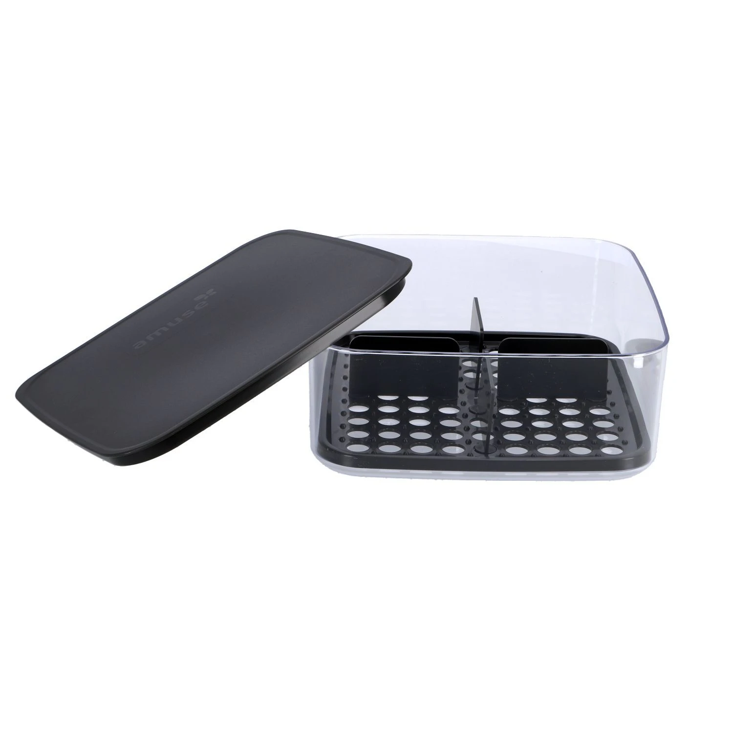 Hou je van kaas? Fantastisch! Met de Specialty Cheese kaasdoor ontwikkelde Amuse de ultieme oplossing om kaas te bewaren. Kijk maar eens: dit nieuwe snufje is volledig transparant, stapelbaar, geurloos én geschikt voor de vaatwasmachine. De doos voorkomt condensatie en je kunt er een stukje keukenpapier in leggen om het vocht te absorberen. Daarnaast krijg je verstelbare en uitneembare tussenschotten om harde en zachte kazen van elkaar te scheiden.