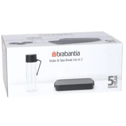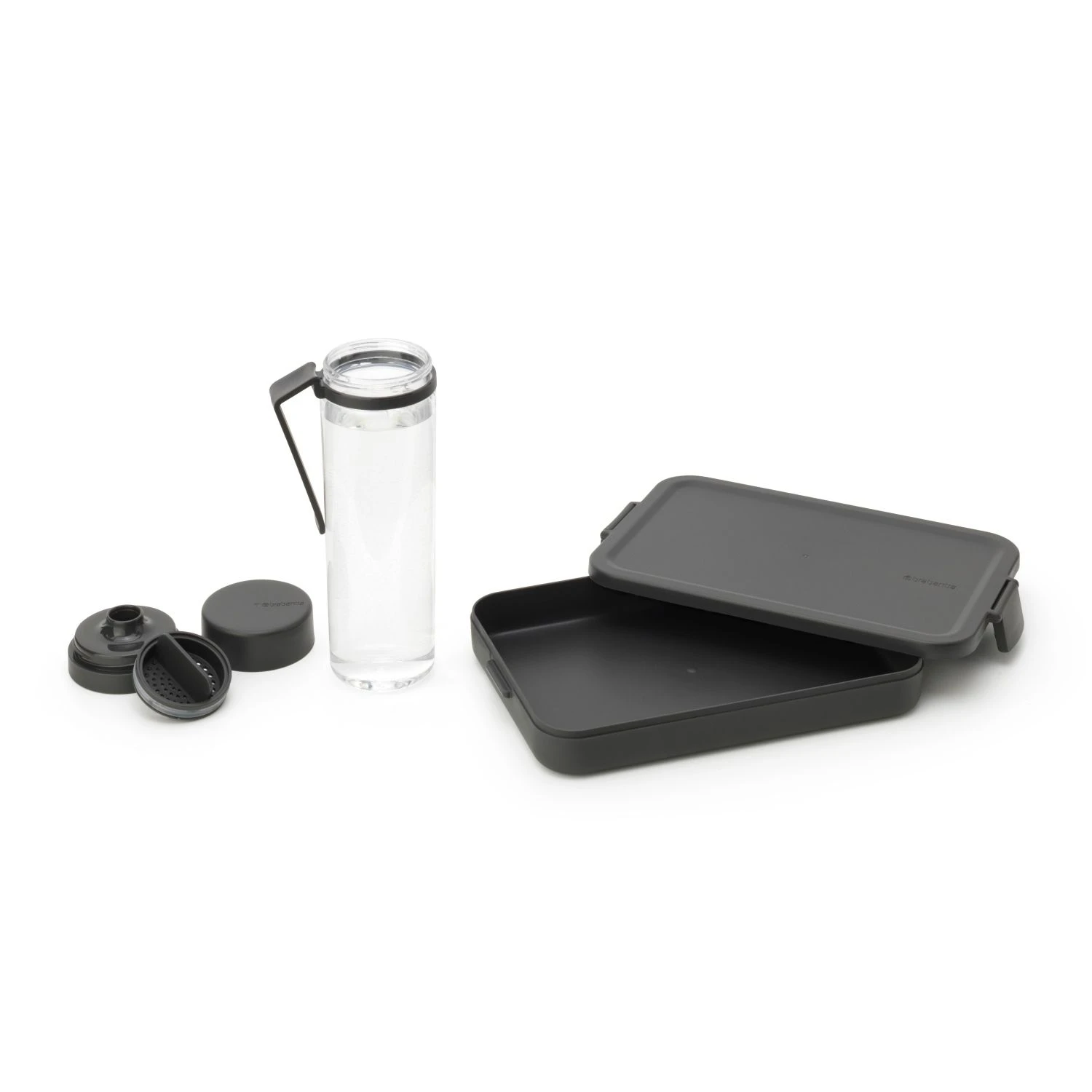 Merk: Brabantia. Inhoud lunchbox: 1,1L. Inhoud waterfles: 0,5L. Afmetingen: 16,5cm x 32cm x 22,5cm. Materiaal: kunststof. Kleur: donkergrijs.
