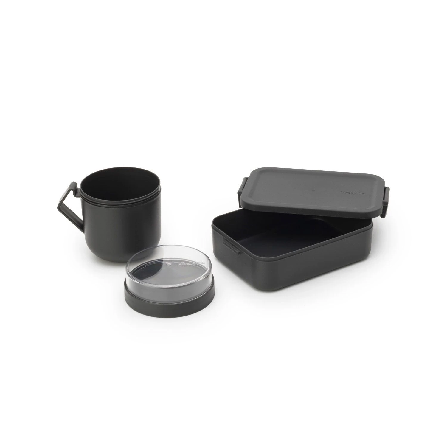Goedkoper, gezonder… Je lunch meenemen is slim. En met deze Brabantia Make & Take Lunchset maak je er een tweegangenmenu van! De lunchbox medium heeft een deksel met clips en ruimte voor 4 boterhammen. En de lekvrije soepbeker heeft een apart bakje voor je toppings wat je erop schroeft. Soep en broodjes… Ready, set, lunch!