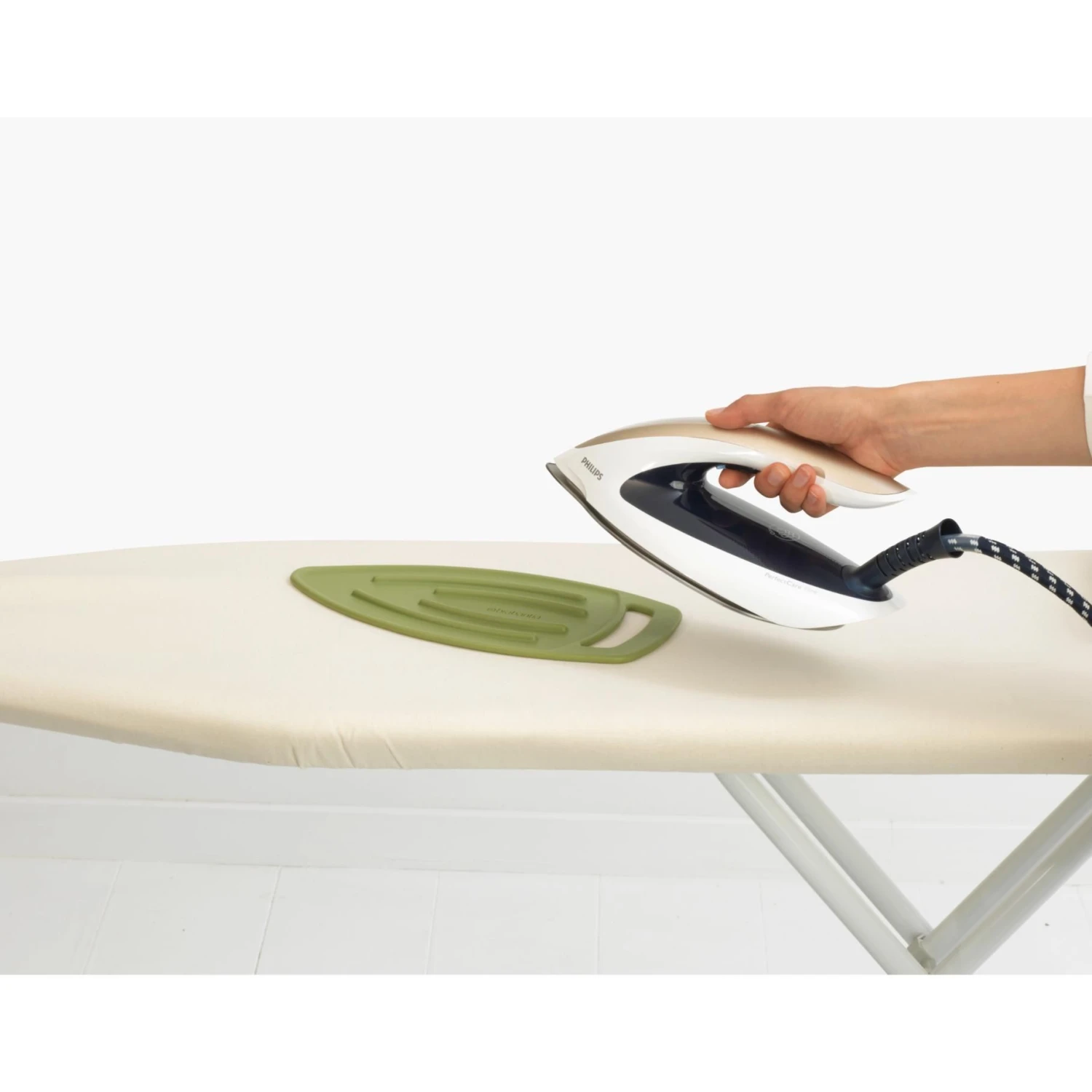 Met het hittebestendige siliconen matje van Brabantia kun je je strijkijzer nu in stijl parkeren, waar je ook maar wilt. Dit geweldig uitziende onderzetter is flexibel en verplaatsbaar, zodat je het gemakkelijk kunt neerleggen waar je maar wilt.