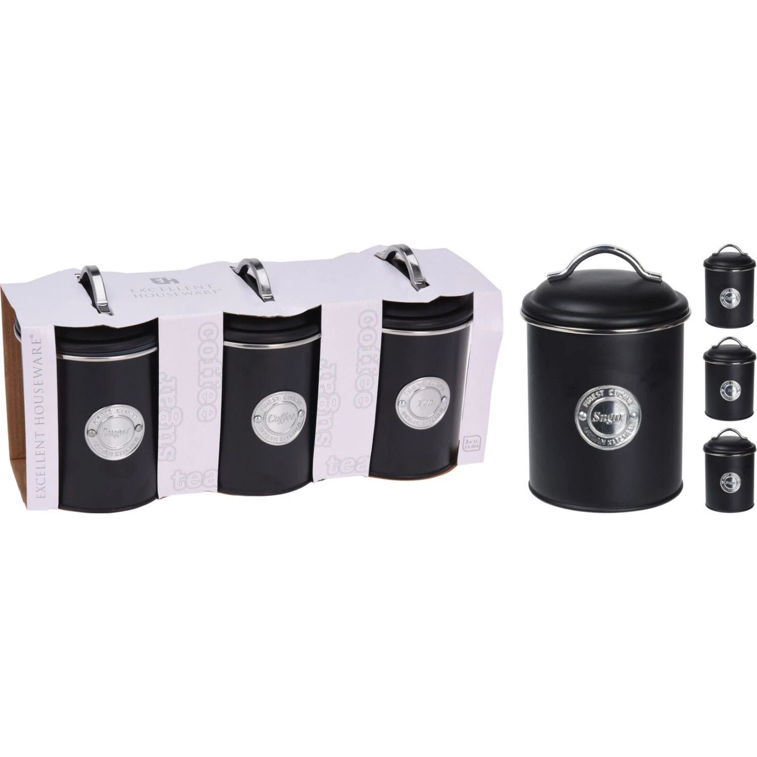 Bewaar je koffie, thee en suiker in deze stoere Excellent Houseware voorraadblikkenset 3-delig. De mat zwarte blikken zijn voorzien van een deksel en hebben aan de voorzijde de tekst; coffee, tea, sugar.