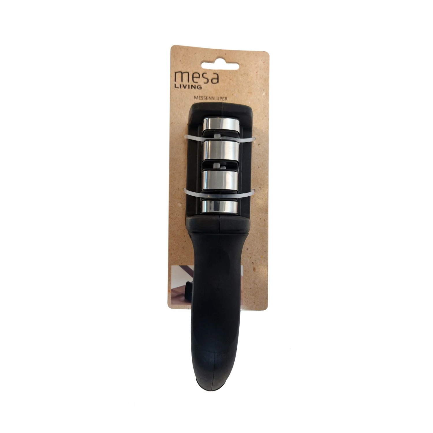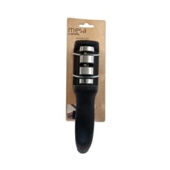 Houd uw messen vlijmscherp met de Mesa Living Messenslijper. Deze praktische slijper is ontworpen voor eenvoudig en effectief gebruik: houd het ergonomische handvat stevig vast en haal uw mes door de slijper om het in een handomdraai te slijpen. De slijper is uitgevoerd in een strakke combinatie van zwart en zilver, wat zorgt voor een moderne uitstraling die perfect past in elke keuken. Voeg de Mesa Living Messenslijper toe aan uw keukengerei voor moeiteloos en efficiënt slijpen, en zorg ervoor dat uw messen altijd klaar zijn voor precisiewerk.