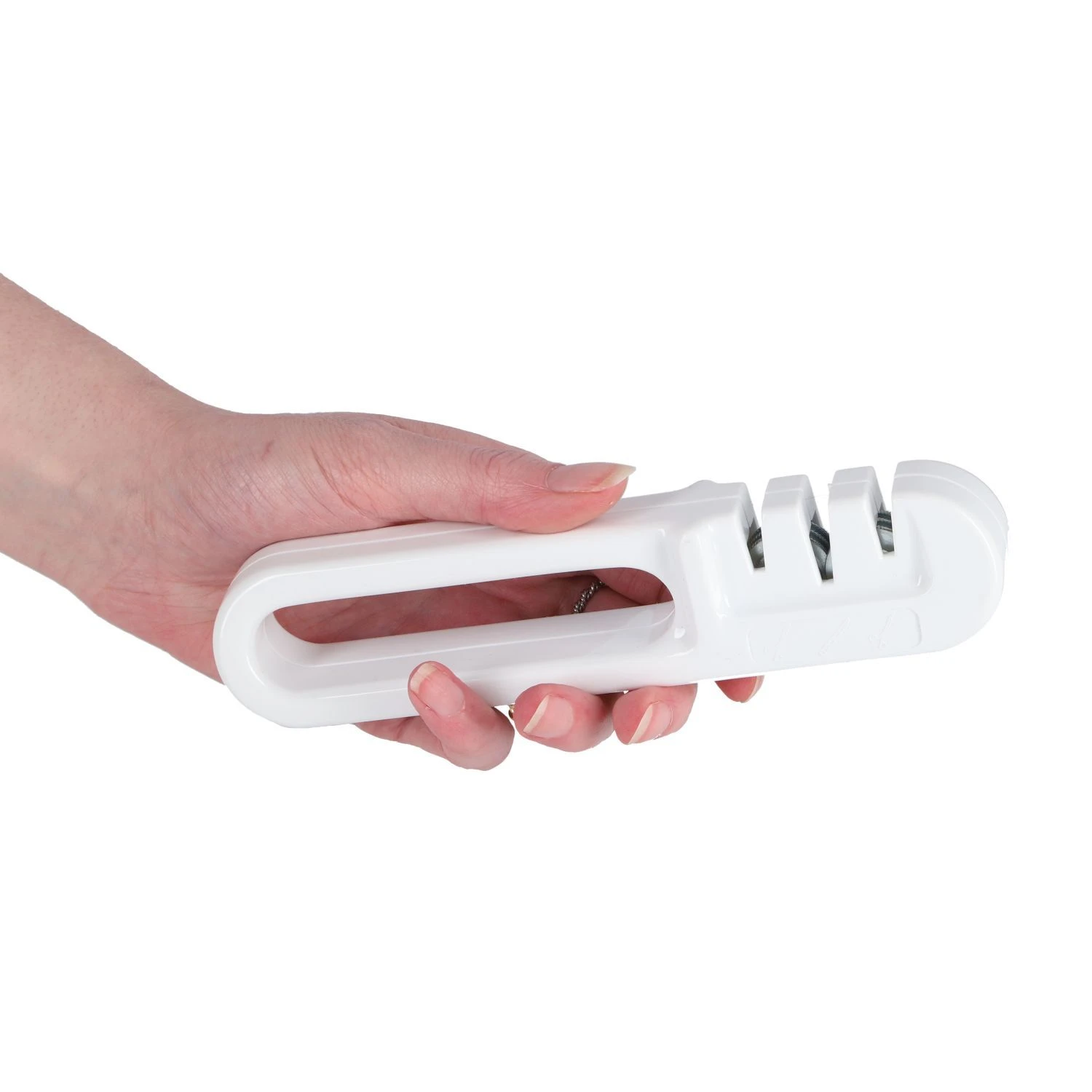 De Metaltex messenslijper is uitgerust met drie slijpers, waardoor je eenvoudig verschillende soorten messen kunt slijpen. Je plaatst gewoon je mes tussen een van de slijpers en trekt het mes er een paar keer doorgeen voor een gelijkmatige slijping. De messenslijper is lichtgewicht en compact en dus makkelijk op te bergen.