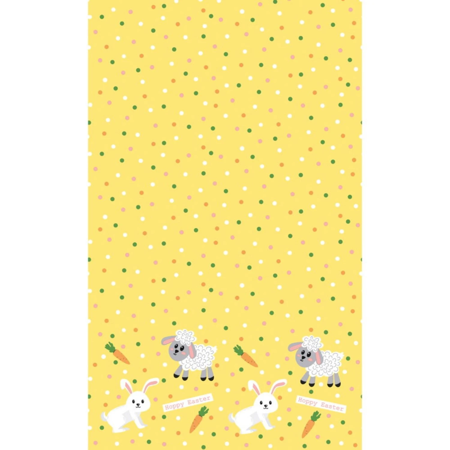 Dit vrolijke Hoppy Easter tafellaken van Duni is perfect om je tafel voor het paasontbijt, de lunch of brunch mee te dekken en er je mooiste servies bovenop te plaatsen. Het gele tafellaken heeft illustraties van mooie schattige lammetjes, konijntjes, wortels en een achtergrond van stippen in de kleuren roze, oranje en groen. Afmeting: 138 x 220 cm.