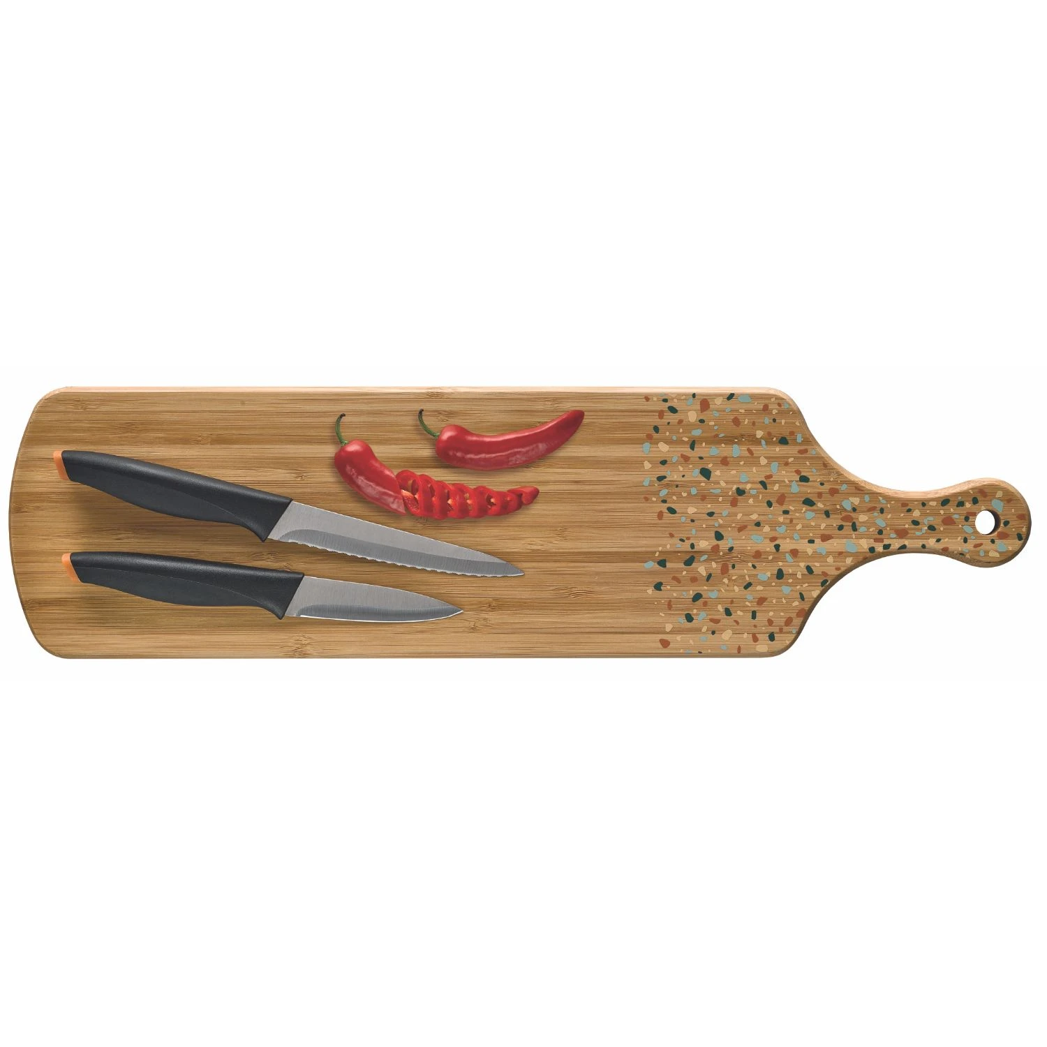 Of jij nu ingrediënten wilt snijden of juist hapjes wilt serveren, je zit altijd goed met deze snijplank van Richardson-Sheffield! Gemaakt van hoogwaardig bamboehout en met een mooi versierd handvat, is deze plank een stijlvolle optie voor in iedere keuken! Daarnaast komt de plank ook met twee hoogwaardige keukenmessen, waardoor het snijden nog gemakkelijker zal zijn!