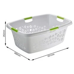 De praktische en stijlvolle Cool Grey Flowers heupwasmand van Rotho heeft een inhoud van 50 liter en is perfect voor het verzamelen van je wasgoed. Deze grijze wasmand is gemaakt van sterk kunststof en voorzien van een vrolijke bloemendecoratie aan de zijkant. Met fijne ronde handvatten zorgt deze wasmand ervoor dat er geen scherpe randen in je handen snijden bij het dragen van een volle lading.