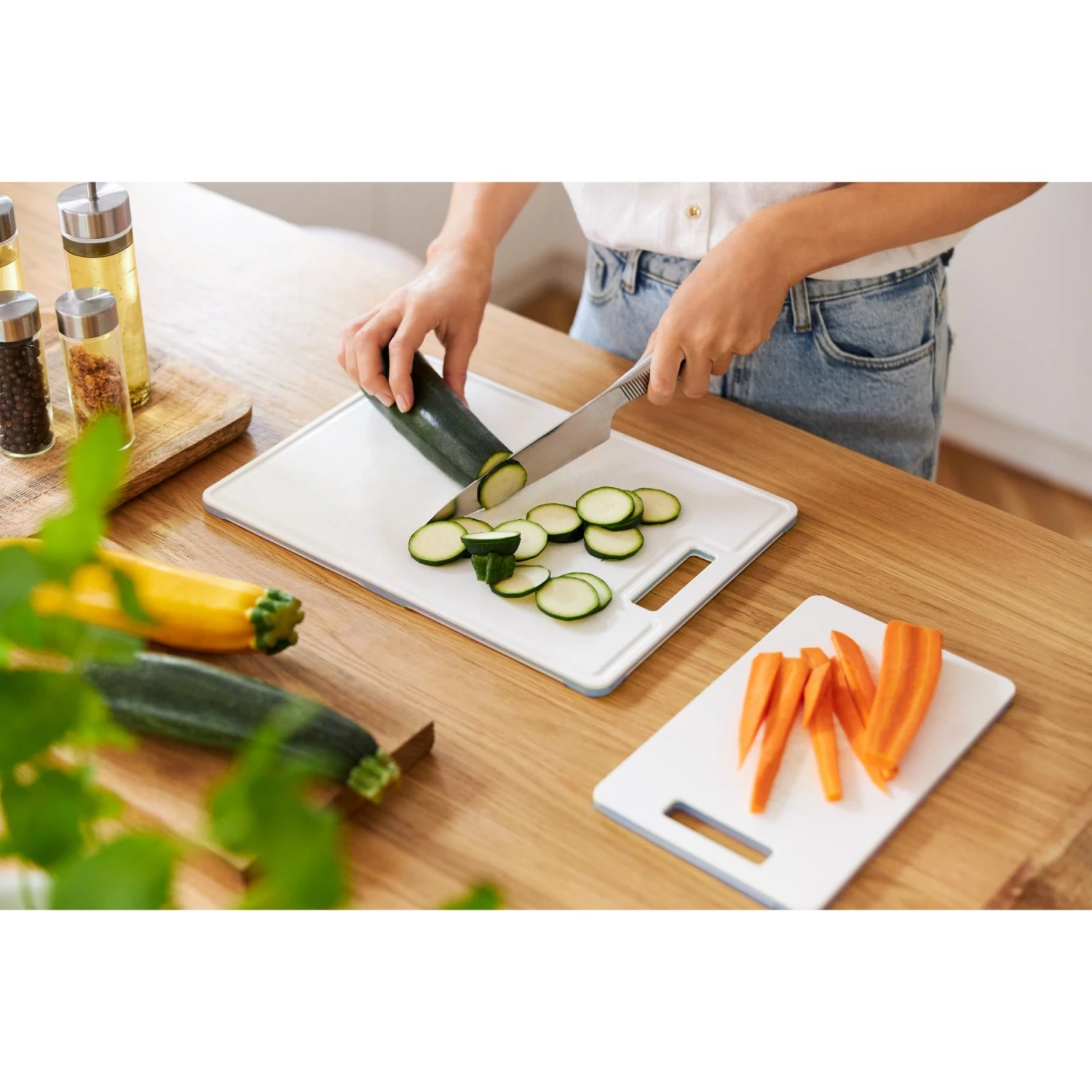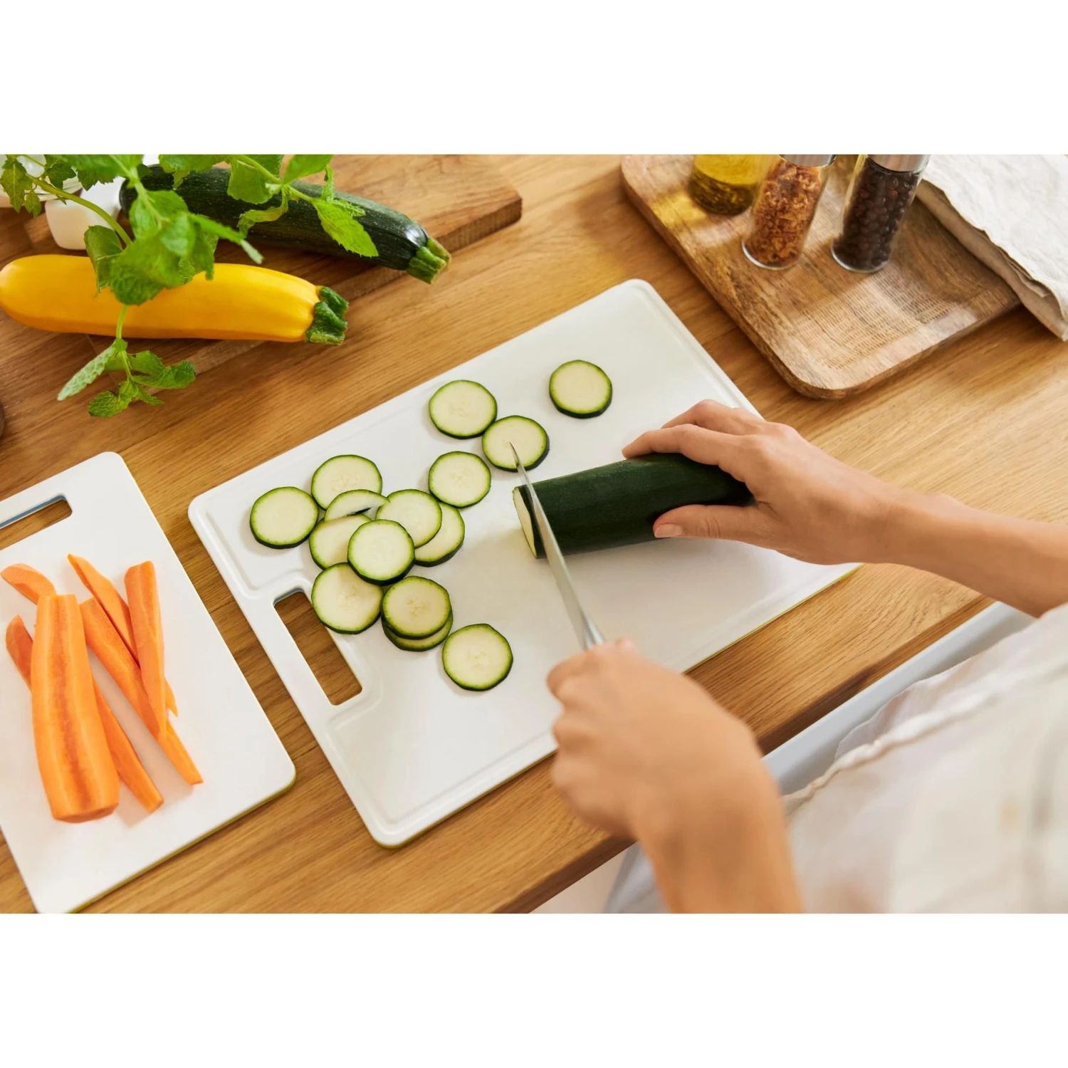 Dankzij de handgreep aan de zijkant is deze snijplank eenvoudig te verplaatsen en op te bergen. De anti-slip hoekjes zorgen ervoor dat de snijplank stevig op zijn plaats blijft tijdens het gebruik, waardoor een veilige snijervaring wordt gegarandeerd.